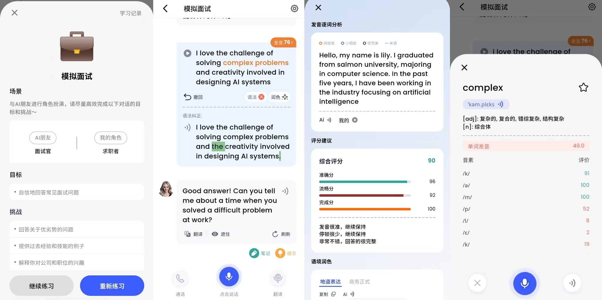 通过独创的音素级发音评估纠正大模型,星空外语能够精准定位发音问题,并带领用户进行针对性练习,有效应对中式发音挑战。这有助于商务用户快速修正发音瑕疵,提升在会议中的表达清晰度和专业性。